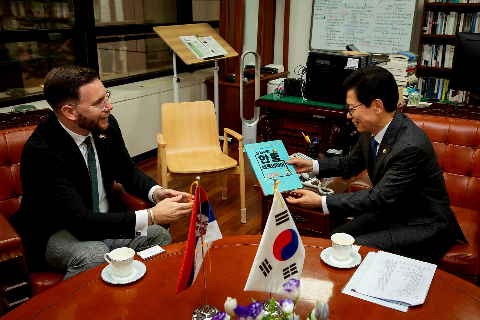 У завршном делу сусрета, амбасадор Грбић је, као донацију Амбасаде, уручио уџбеник за учење српског језика на корејском језику, истичући да издање може допринети бољем упознавању Србије и подстаћи интересовање за српски језик и културу међу корејским парламентарцима, али и другим корисницима услуга ове установе.