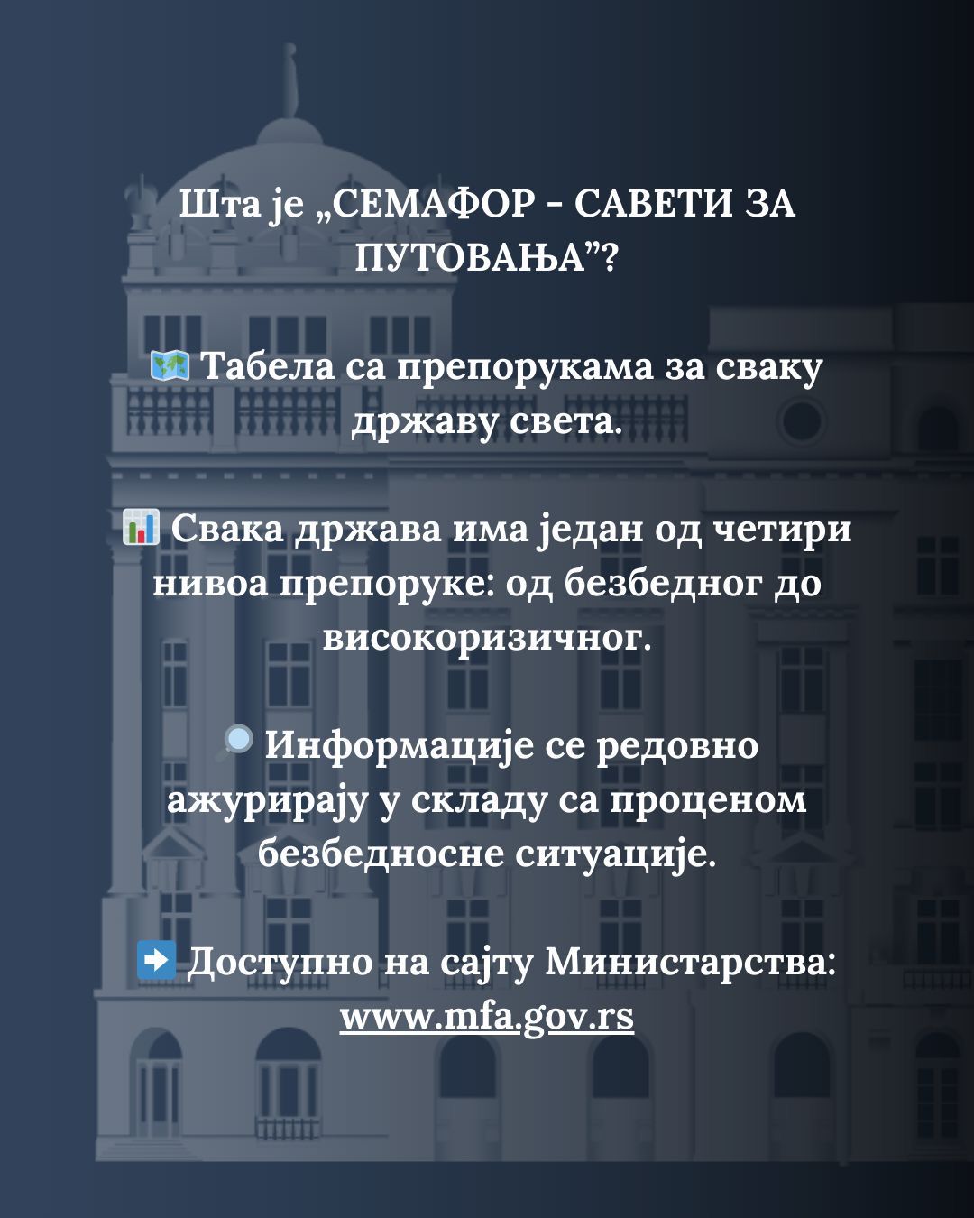 Пре путовања саветујемо да се информишете на сајту Министарства спољних послова Републике Србије о безбедносној ситуацији у земљи у коју планирате да путујете или кроз коју транзитирате.